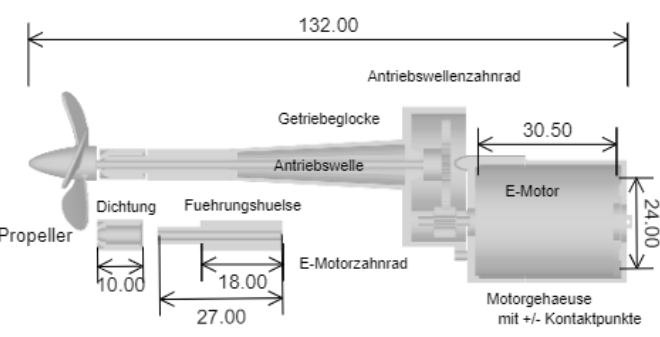 In the following image, the drive unit is shown. It consists of the motor, gearbox, shaft, and propeller unit.