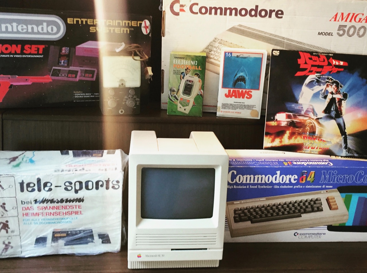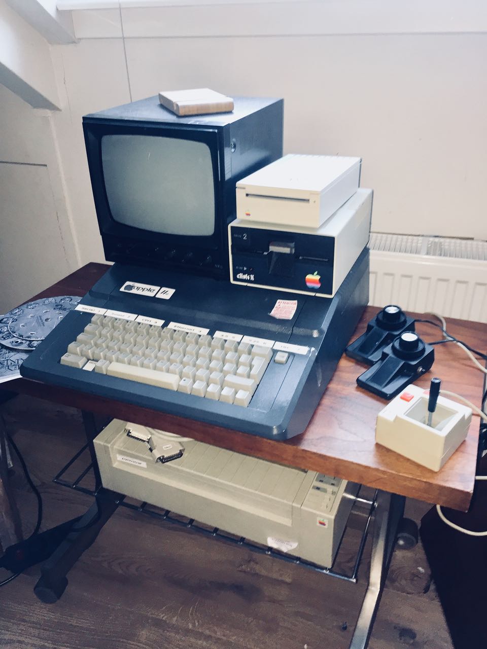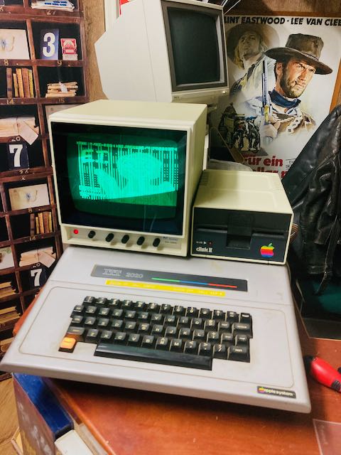 One of my absolute favorites is this Apple ][ Europlus from 1981. In fact, the case once served as a home for a family of mice; accordingly, the cleaning process was quite extensive. Equipped with a memory expansion from 48 to 64 kilobytes, a Microsoft CP/M Softcard, a Super-Serial-Card, and a disk card, it’s now possible to explore the software from the „Computer Stone Age.“ The software itself can be easily transferred using an iPhone and the cassette output of the Apple.